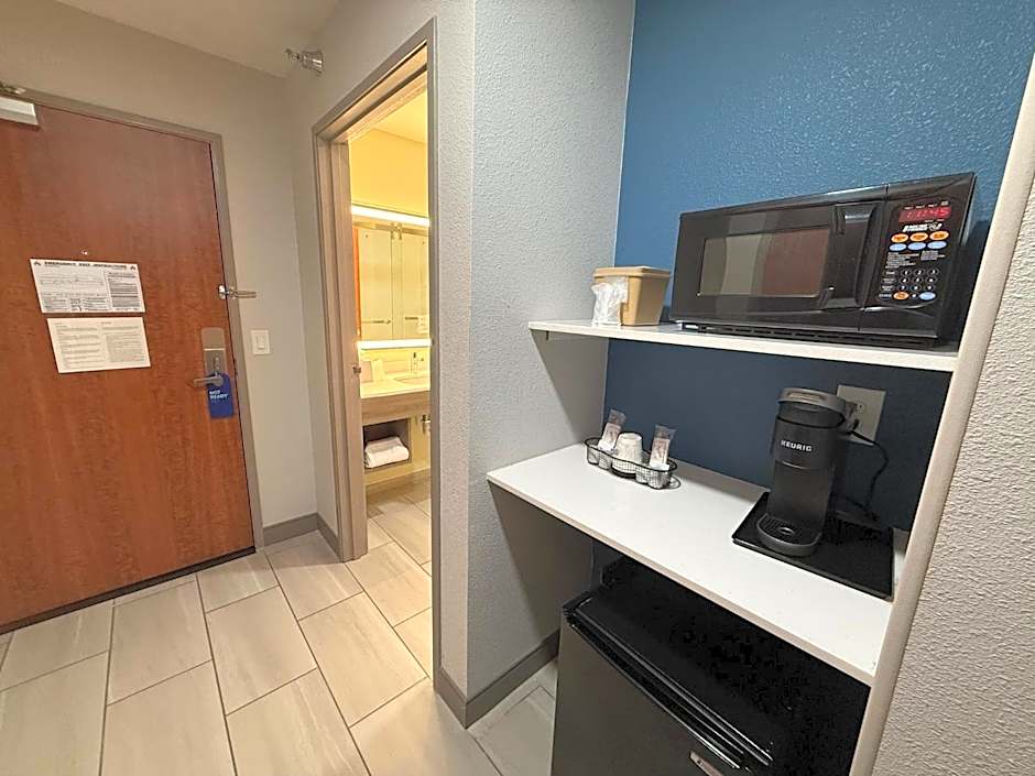 Room features a flat-screen TV, a microwave and a refrigerator.